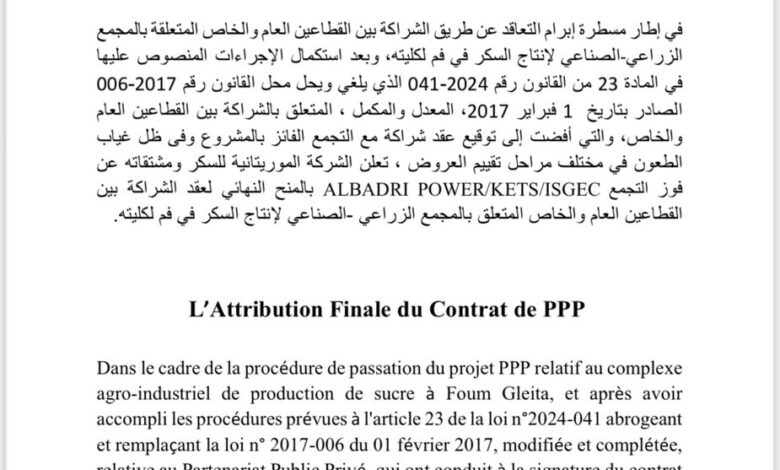 (نواكشوط) – أعلنت الشركة الموريتانية للسكر ومشتقاته عن فوز تجمع ALBADRI POWER / KETS / ISGEC بالمنح النهائي لعقد الشراكة بين القطاعين العام والخاص، المتعلق بالمجمع الزراعي -الصناعي لإنتاج السكر في فم لكليته.