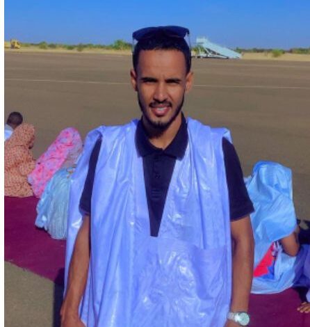 يظهر في هذه الصورة الشاب والاطار التراد ولد محمد ولد التراد ولد آب ولد الشيخ محمد فاضل وهو في مطار النعمة لحظة استقبال سكان ولاية الحوض الشرقي في حشود منتظمة على طريق المطار يحملون اللافتات المرحبة برئيس الجمهورية محمد ولد الشيخ الغزواني ومثمنين المشاريع التنموية التي سيشرف على اطلاقها خلال الزيارة.